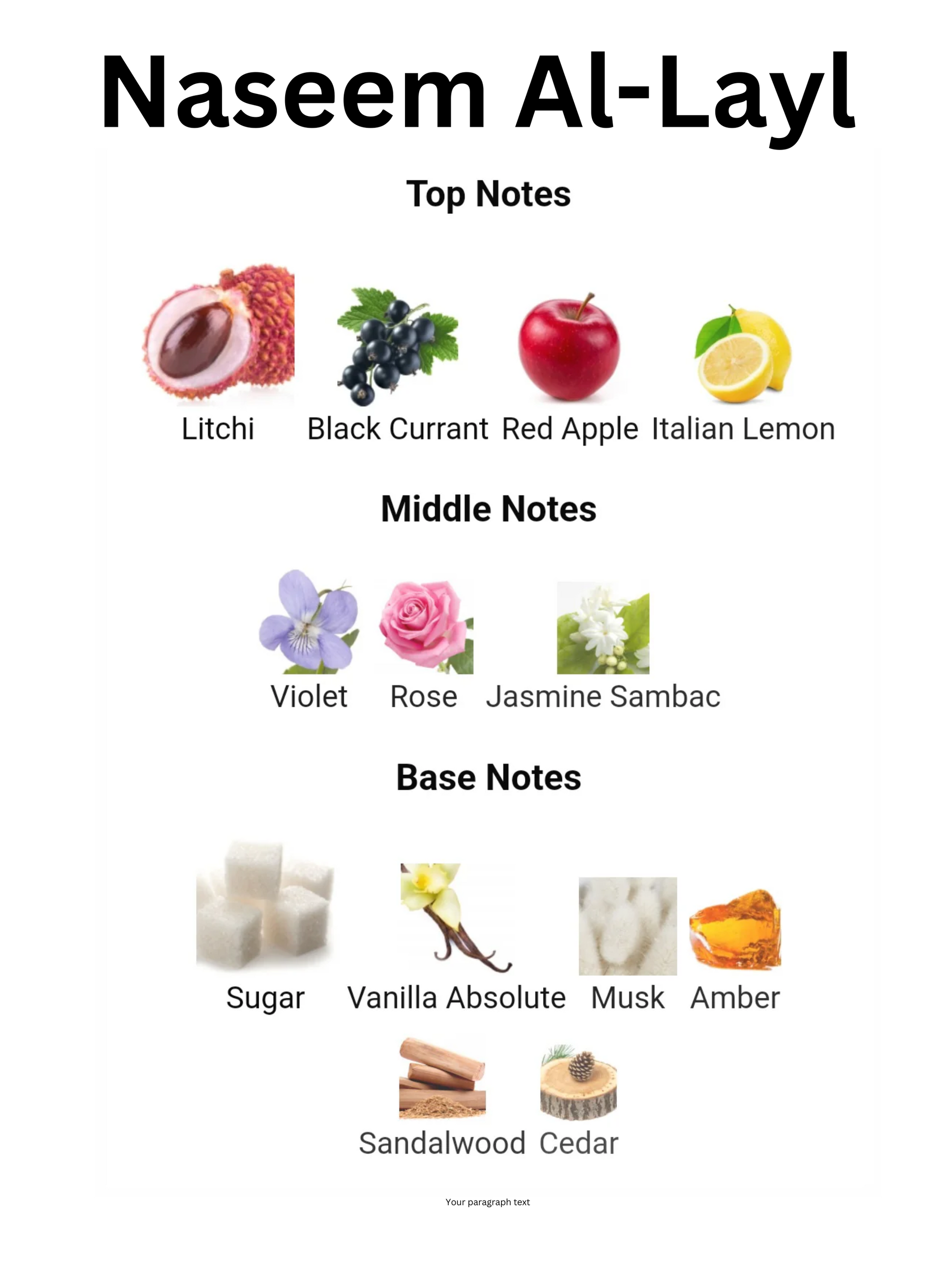 Top Notes are Litchi, Black Currant, Red Apple and Italian Lemon;